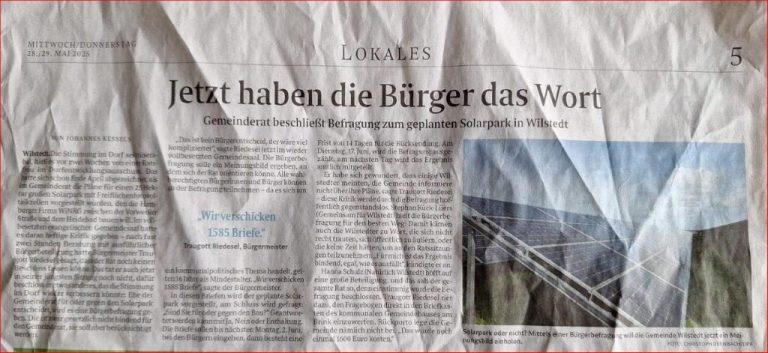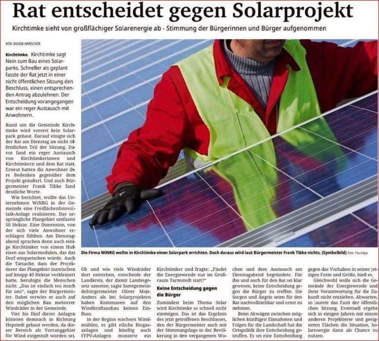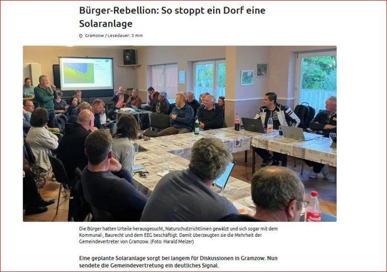 „Inzwischen hat sich herumgesprochen, dass die Dörfer bei den Vorhaben oft viel schlechter wegkommen als versprochen. Es gibt keine verbindlichen Regeln; die Politik auf Bundes- und Landesebene lässt den Investoren oft freie Hand. Ein Projekt in D. hat die ganze Ortschaft gespalten. Die Projektierer haben sich trotz aller Bedenken mit einer umstrittenen Photovoltaik-anlage durchgesetzt .“