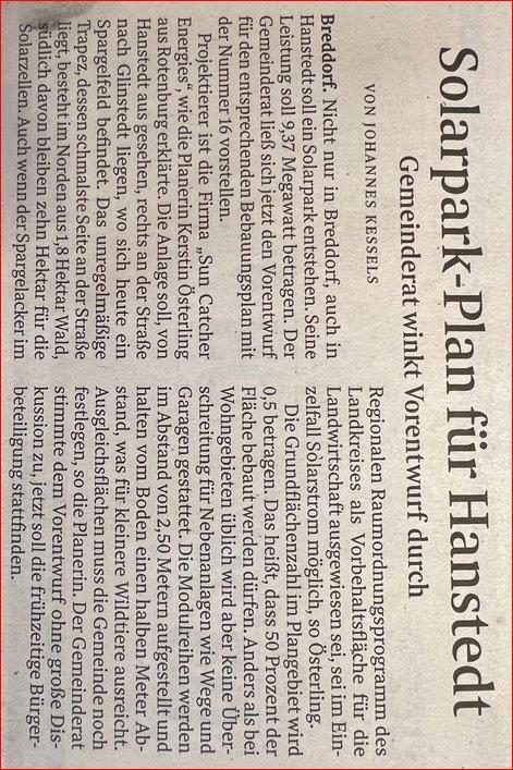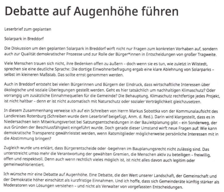 ein "Ja" zu einem überdimensionierten Solargiganten im beschaulichen Breddorf nur für mehr Geld in der Zukunft?